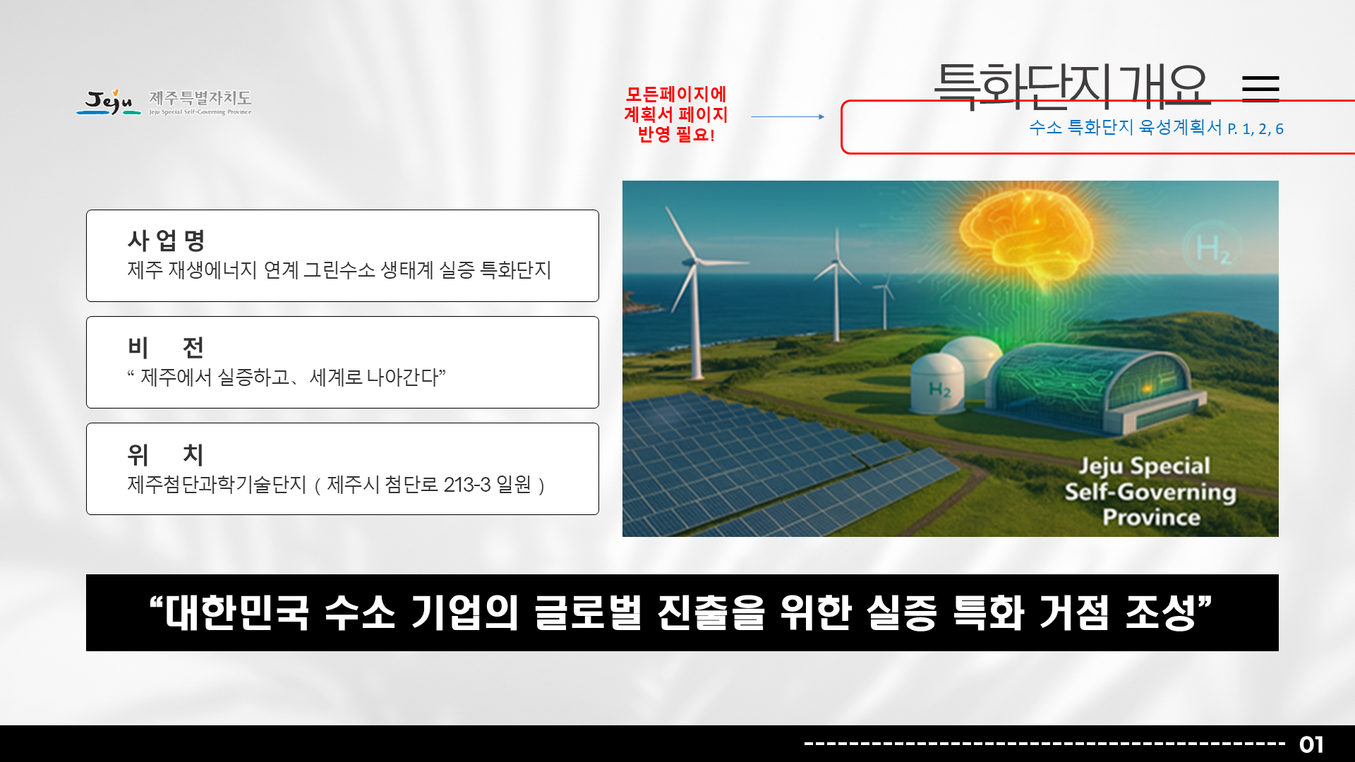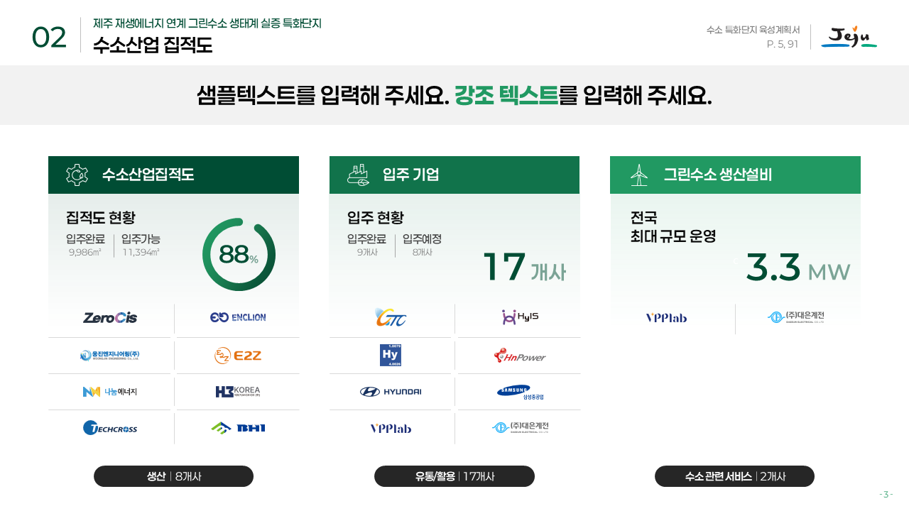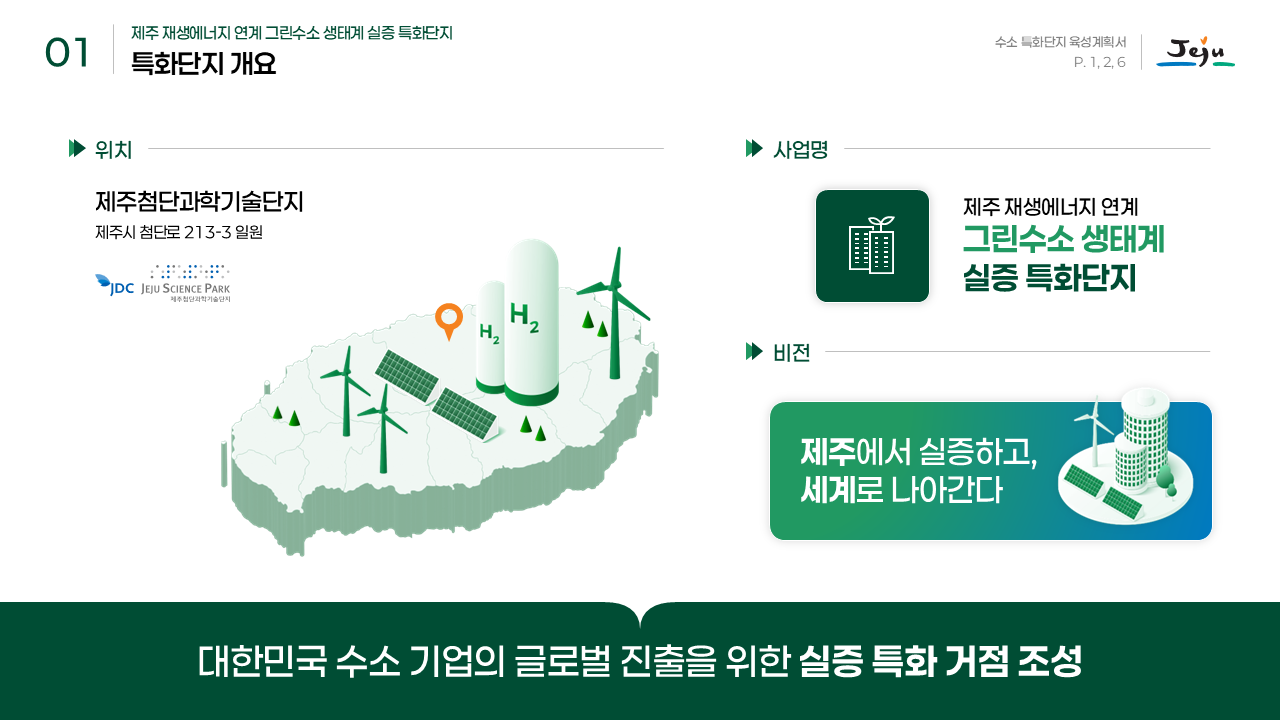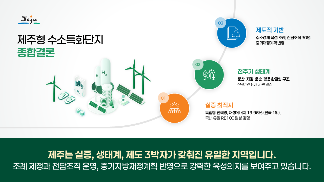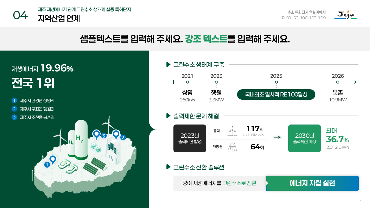 행사/발표자료 행사/발표자료 행사/발표자료 제주도청 그린수소 특화단지 발표자료 2025-12-16 프로젝트 개요 제주도청의 그린수소 생태계 실증 특화단지 사업을 대내외에 효과적으로 소개하기 위해 기존 원고를 기반으로 발표자료를 기획·디자인한 프로젝트입니다. 팀피피티 솔루션 기존 텍스트 중심 원고를 분석해 그린수소 생산–저장–활용으로 이어지는 생태계 구조와 실증 사업의 의미가 한눈에 보이도록 스토리라인을 재구성했습니다. 친환경 에너지 정책의 방향성과 제주도의 지역적 특성이 동시에 전달될 수 있도록 정제된 그린 톤의 디자인으로 시각화했습니다. 주요 성과 Before & After