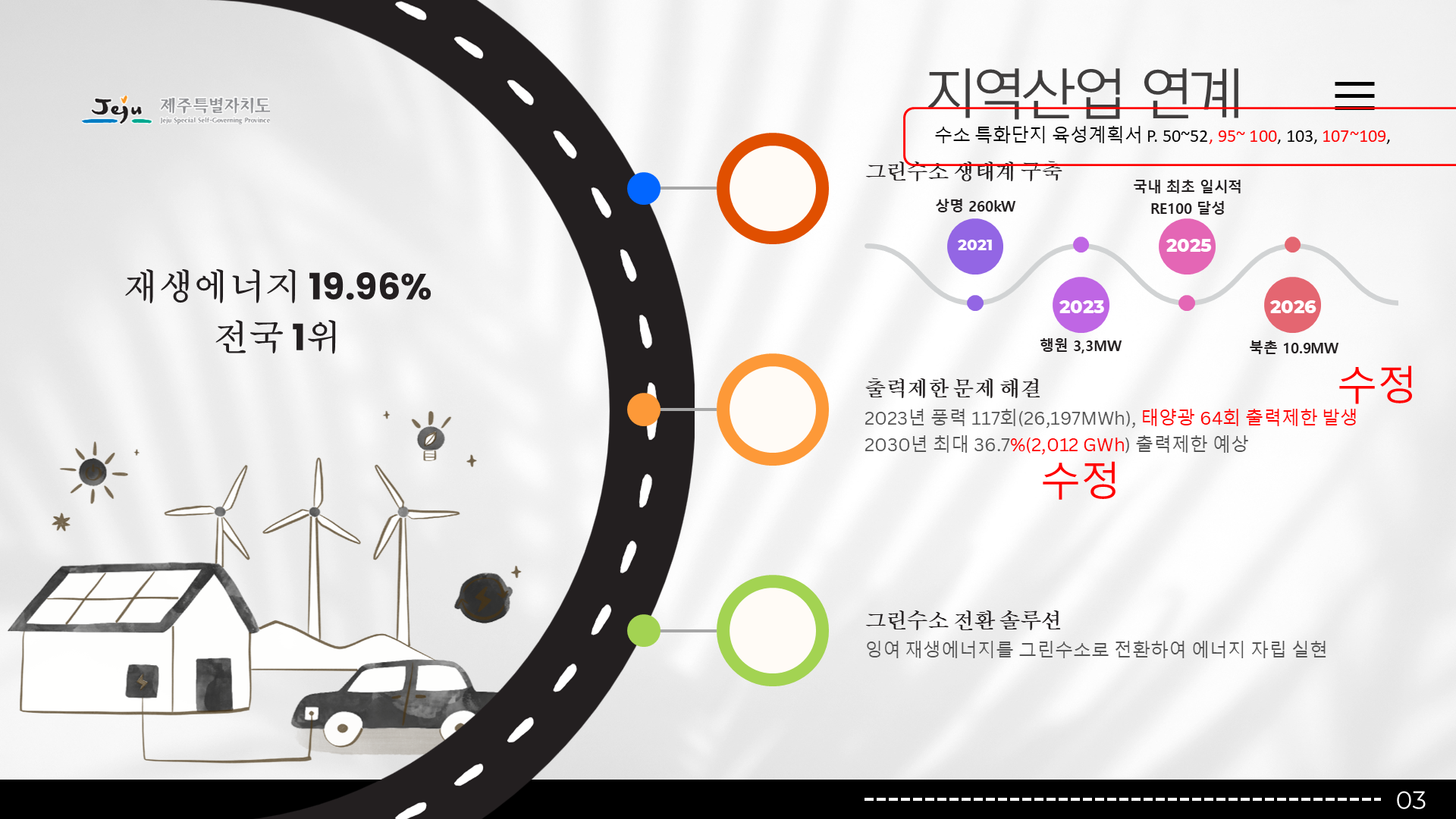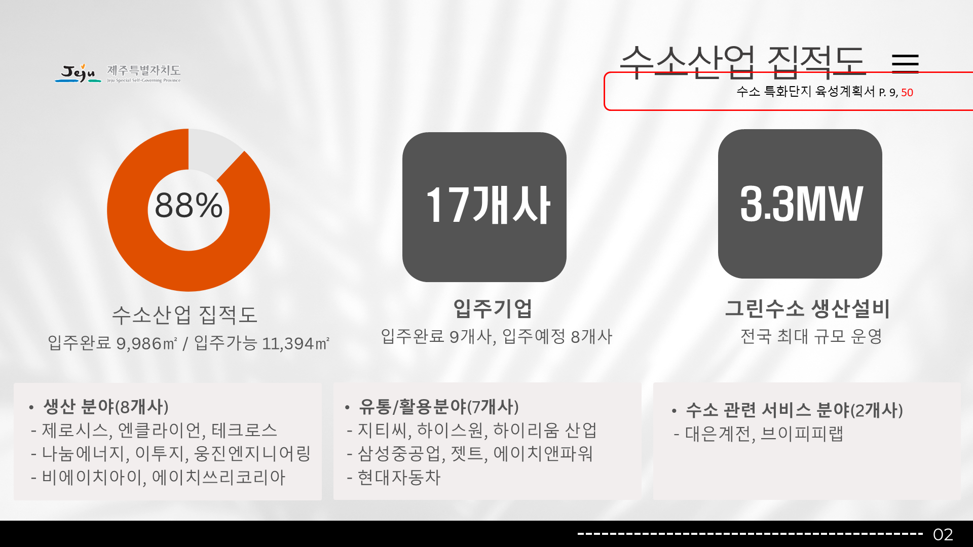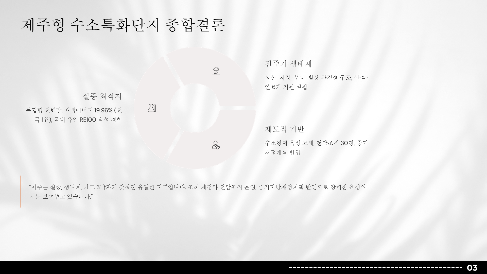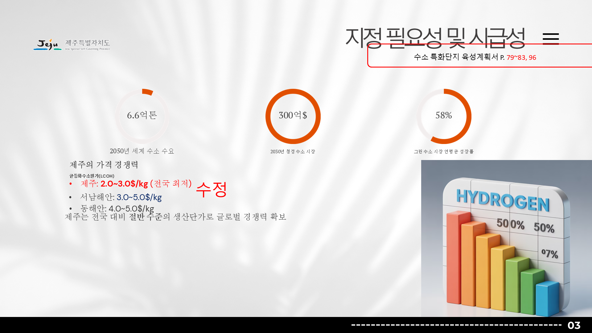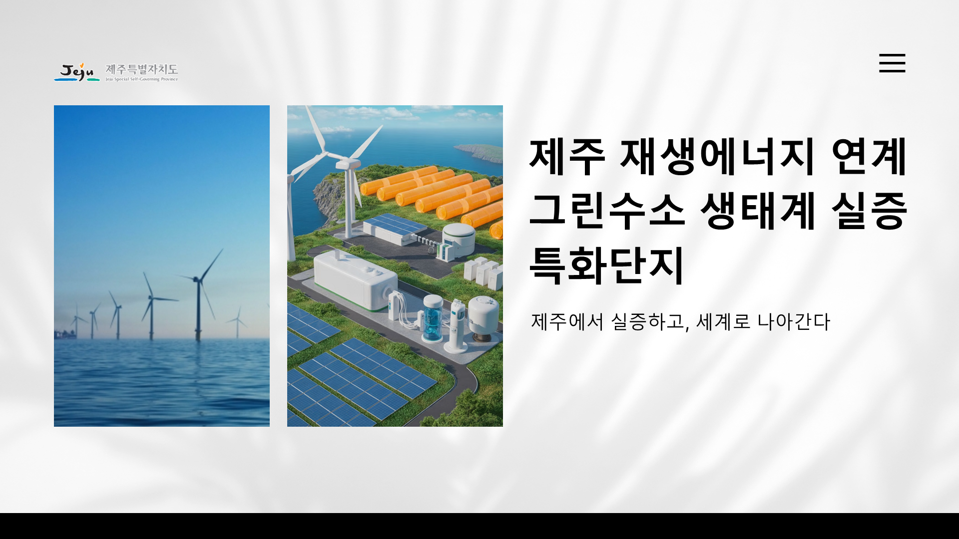 행사/발표자료 행사/발표자료 행사/발표자료 제주도청 그린수소 특화단지 발표자료 2025-12-16 프로젝트 개요 제주도청의 그린수소 생태계 실증 특화단지 사업을 대내외에 효과적으로 소개하기 위해 기존 원고를 기반으로 발표자료를 기획·디자인한 프로젝트입니다. 팀피피티 솔루션 기존 텍스트 중심 원고를 분석해 그린수소 생산–저장–활용으로 이어지는 생태계 구조와 실증 사업의 의미가 한눈에 보이도록 스토리라인을 재구성했습니다. 친환경 에너지 정책의 방향성과 제주도의 지역적 특성이 동시에 전달될 수 있도록 정제된 그린 톤의 디자인으로 시각화했습니다. 주요 성과 Before & After